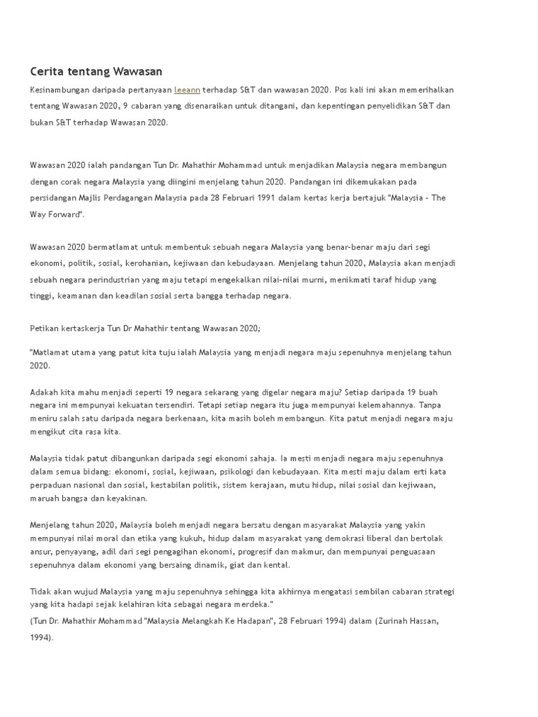 Definisi wawasan 2020 dipostkan pada: Mahathir semasa mesyuarat majlis perdagangan malaysia pada 28 februari 1991. Wawasan 2020 tidak meminta malaysia menjadi negara barat atau jepun tetapi sebuah negara baru dan lebih mantap cabaran kedua. Dr zakir naik talks about dr mahathir. J a w a p a n :