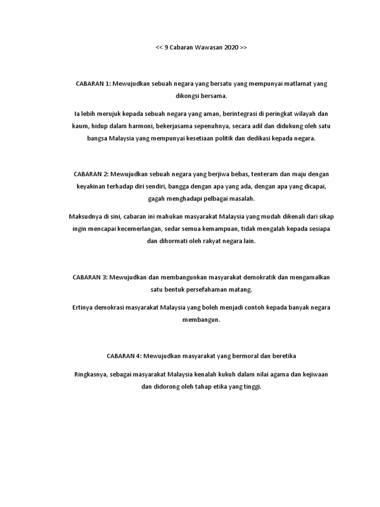 Cabaran pertama negara bersatumewujudkan sebuah negara yang bersatuyang mempunyai matlamat yang dikongsibersama. Wawasan 2020 tidak meminta malaysia menjadi negara barat atau jepun tetapi sebuah negara baru dan lebih mantap cabaran kedua. Dr mahathir sebelum ini telah menggariskan 9 cabaran utama yang perlu diatasi bagi mencapai matlamat wawasan 2020. Get this from a library! Kunci kepada pencapaian negara maju ialah dengan mengatasi sembilan cabaran strategik.