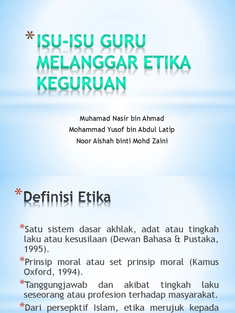 Assignment EDU from image.slidesharecdn.com Namun, dalam iklan tersebut terdapat scene di mana seorang guru berbicara sambil membawa sebungkus mie sedaap. Melanggar prinsip etika kerja yang sedia ada. Kesantunan guru kepedulian guru penampilan guru berniaga di sekolah kerja sambilan pengurus masa pengurus kewangan. Kesemua isu ini boleh menjejaskan kelancaran pentadbiran organisasi di sekolah. Ilmu yang menyelidiki mana yang baik dan mana yang benar perilaku etika meliputi: Antara isu etika guru yang dilaporkan adalah seperti isu kesantunan guru, isu kepedulian guru, isu penampilan guru, isu guru berniaga di sekolah, pengurusan kewangan, pengurusan masa dan kerjaya sambilan guru. Etika bagi guru adalah terhadap peserta didiknya, terhadap pekerjaan dan terhadap tempat kerja. Melanggar etika keguruan ahli kumpulan 2 :