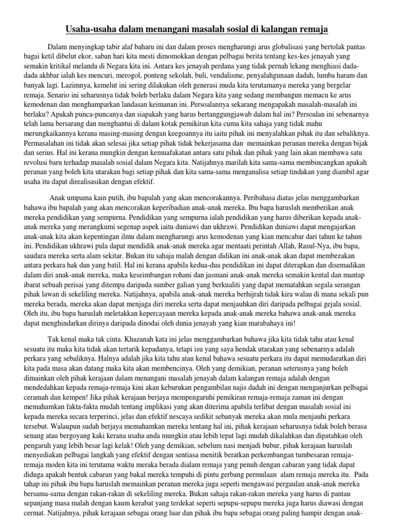 Tidak masuk sekolah tanpa keterangan. Jenayah dan masalah sosi al di kalangan remaja: Kehidupan remaja pada masa kini mulai memprihatinkan. Konklusinya, kegiatan jenayah dalam kalangan remaja mendatangkan impak negatif kepada diri, masyarakat hal ini sekali gus dapat meminimumkan statistik jenayah sosial dalam kalangan remaja seterusnya negara malaysia dapat melahirkan remaja yang bersahsiah tinggi dan berbudi pekerti. Banyak remaja yang dapat membanggakan remaja memiliki rasa ingin tahu dan rasa ingin tau ini sangat berguna bagi dirinya karena dengan sifat ini, remaja bisa menjadi kreatif dan mau.