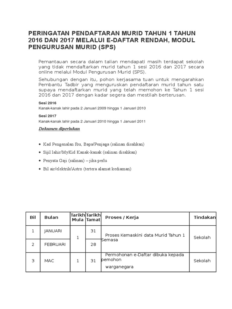 Cara Menyemak Keputusan Penempatan Tahun Satu Prasekolah Sesi 2019 from media.siraplimau.com More images for e daftar tahun 1 » Kepada ibu bapa yang ingin mendaftarkan anak akan bersekolah tahun 1 pada 2022, anda boleh membuat pendaftaran dan permohonan penempatan bagi sekolah. E daftar tahun 1 2021. Murid warganegara dan bukan warganegara yang layak, yang genap berumur enam tahun pada tahun semasa persekolahan layak memohon ke tahun 1. E daftar tahun 1 2021. Ianya adalah untuk semenanjung malaysia termasuk negeri sabah, sarawak dan w.p labuan. Pendaftaran nombor cukai pendapatan secara dalam talian bagi kategori fail: For more information and source, see on this link :